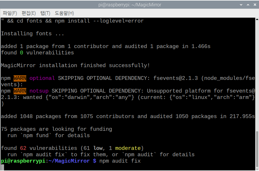 홈페이지에는 안나와 있지만 터미널에서 안내를 하는 대로 취약성을 고치도록 합니다. 우리가 사용하는 소스 코드나 npm 등은 계속해서 발전을 합니다. 기능이 추가되고 문제가 해결되기도 하고 없던 문제가 생기기도 합니다. 따라서 이 명령을 실행하라는 메시지가 나오지 않을 수도 있습니다. 다시말하면 이 명령은 라즈베리파이와 각종 오픈소스 프로젝트의 상황에 따라서 안나올 수도 있습니다. 오픈 소스는 여러 사람들이 작업을 하기 때문에 새로운 버전이 나오면 상황은 변할 수 있습니다.